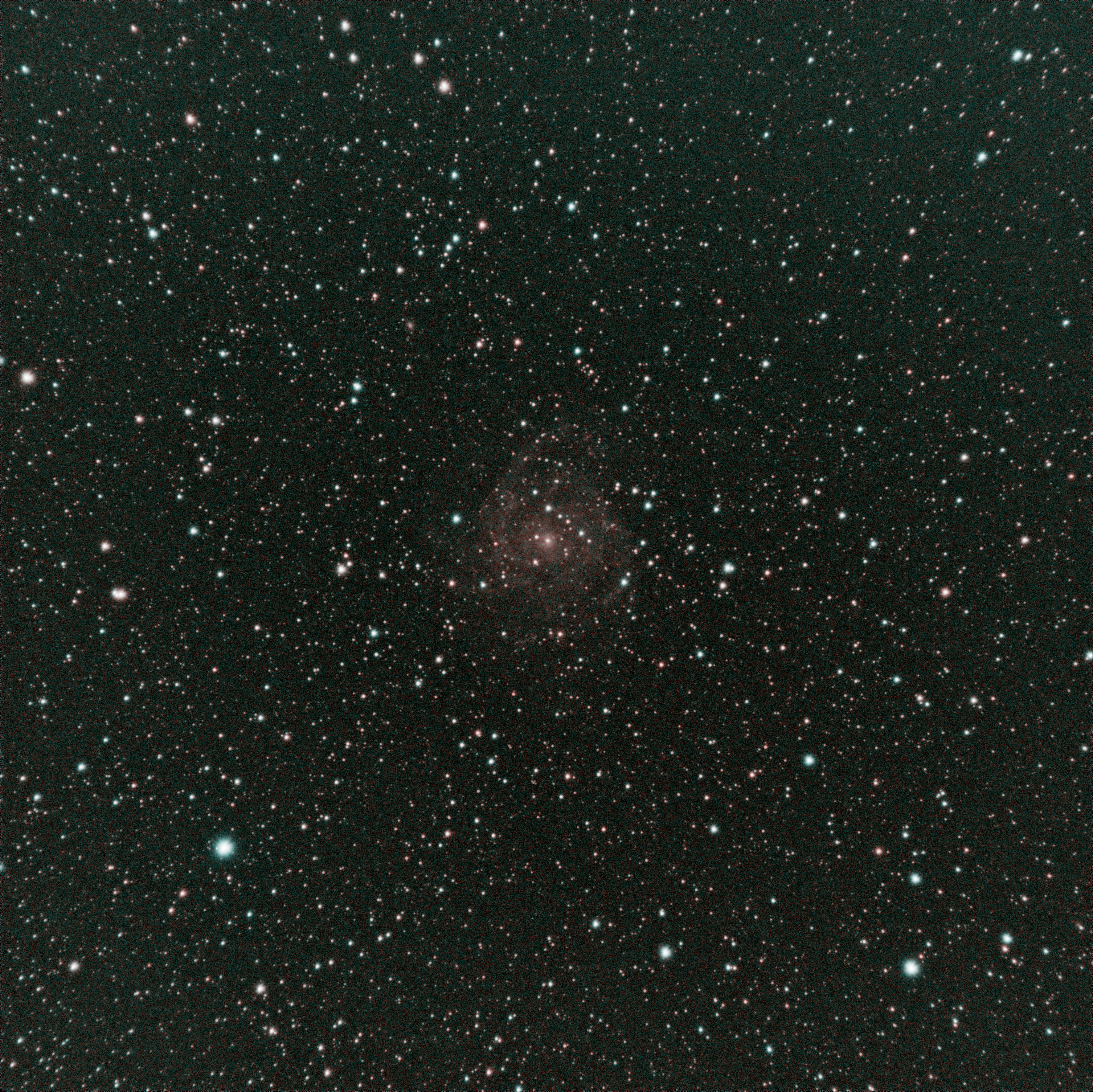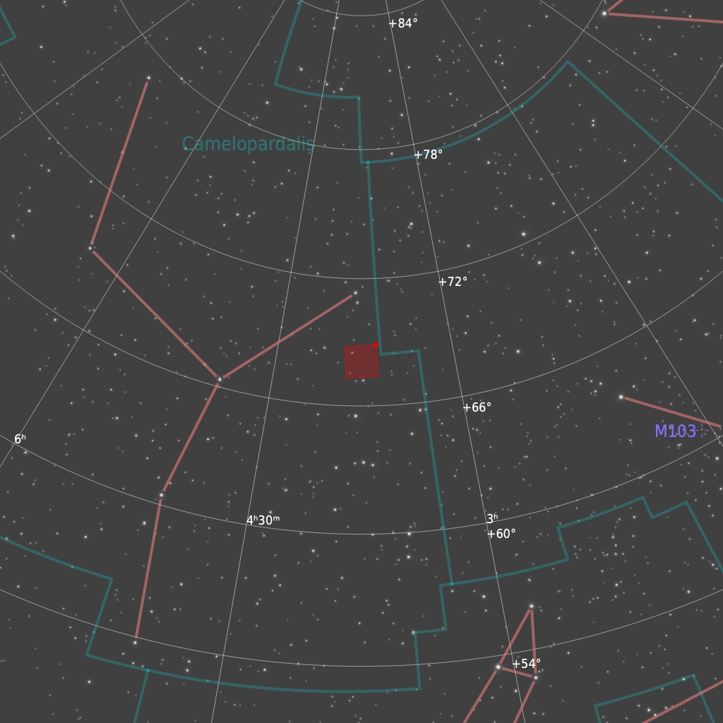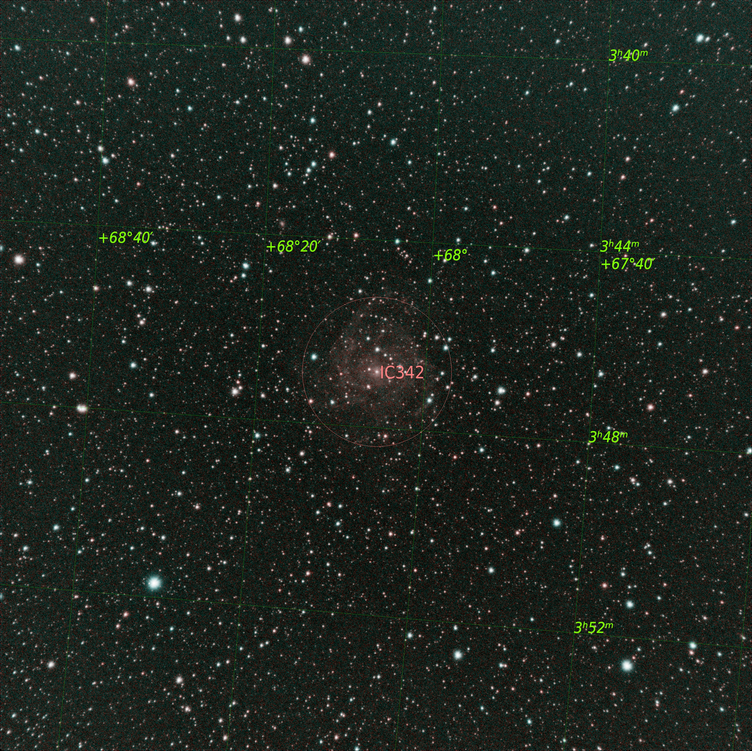 IC 342 is an intermediate spiral galaxy in the constellation Camelopardis. It is also known as "the hidden galaxy" as it is partially obscured by interstellar dust clouds. Were it not for these dust clouds it would be visible with the naked eye. Its distance from us is between 7 and 11 million light years and has a diameter of approximately 75000 light years.