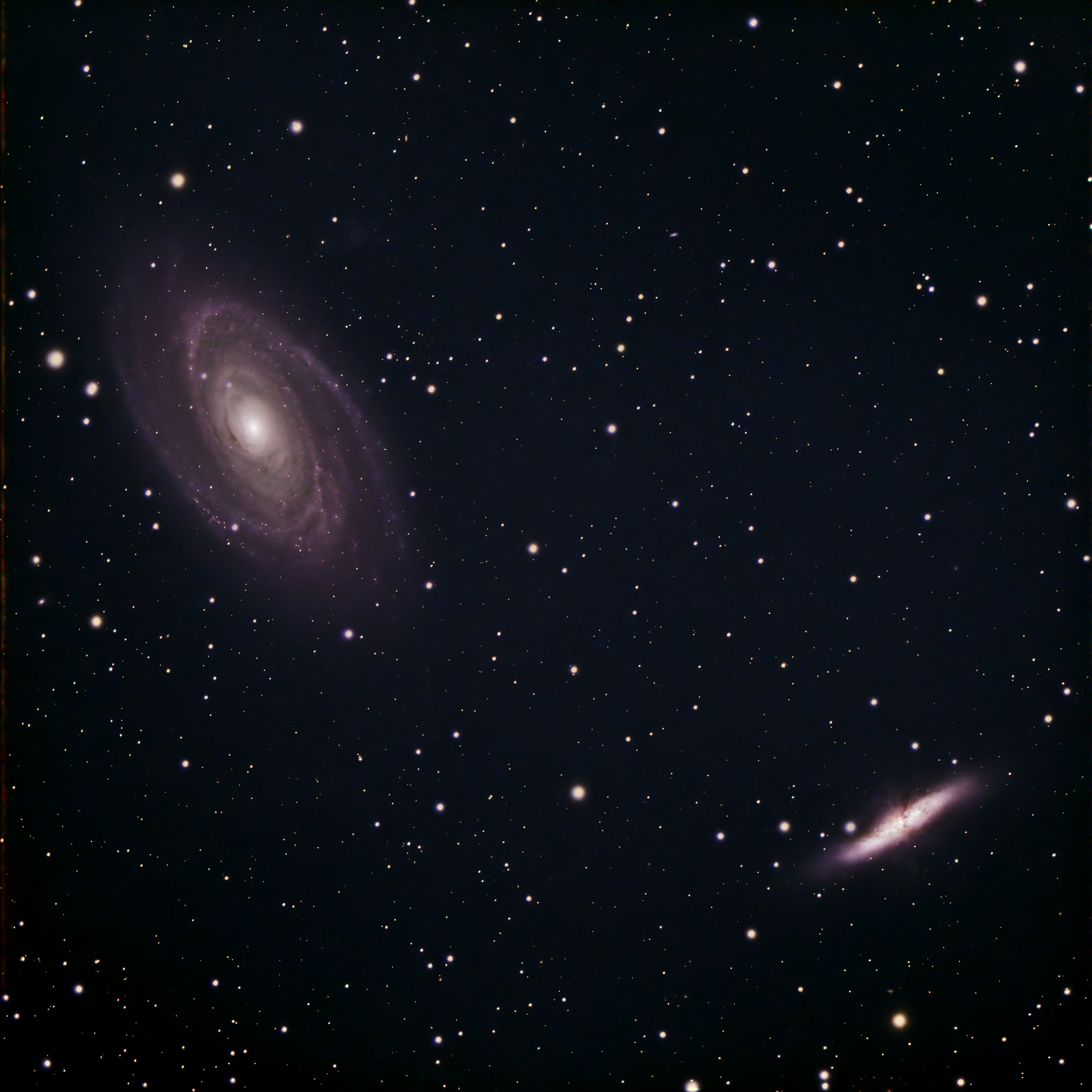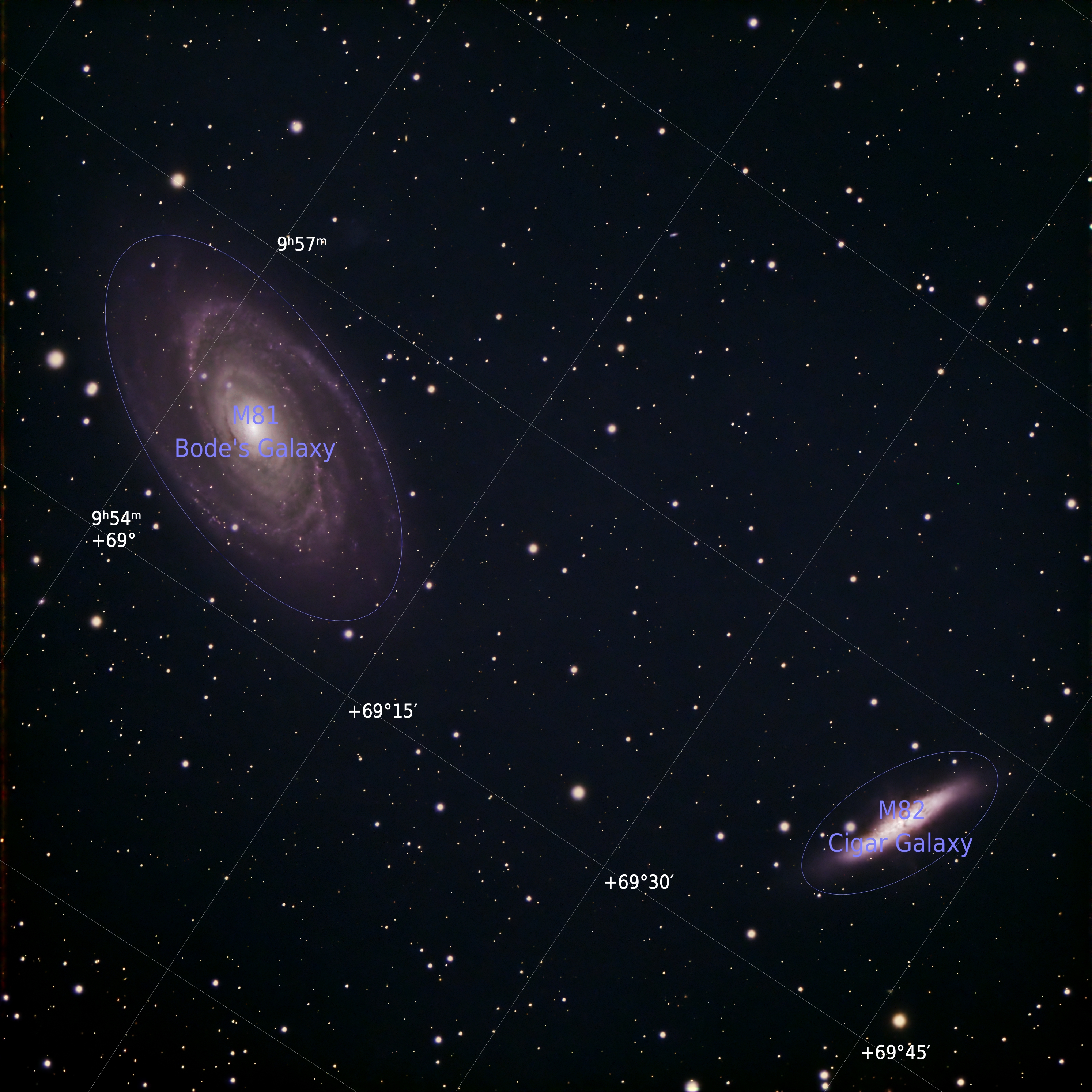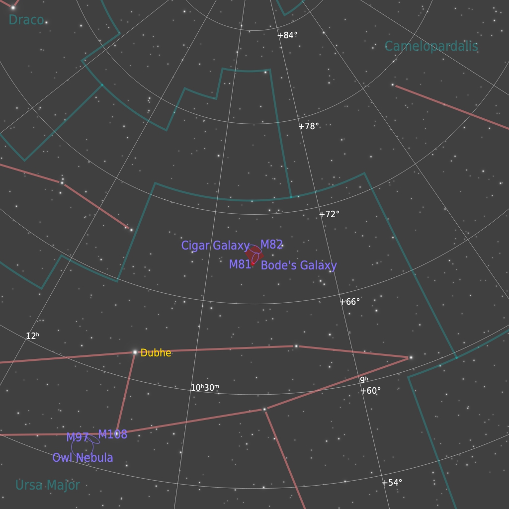 These two galaxies appear in the constellation Ursa Major. M81 (Bode's Galaxy) & M82 (Cigar Galaxy) are approximately 12 million light years distant and are separated by at least 130,000 light years.
