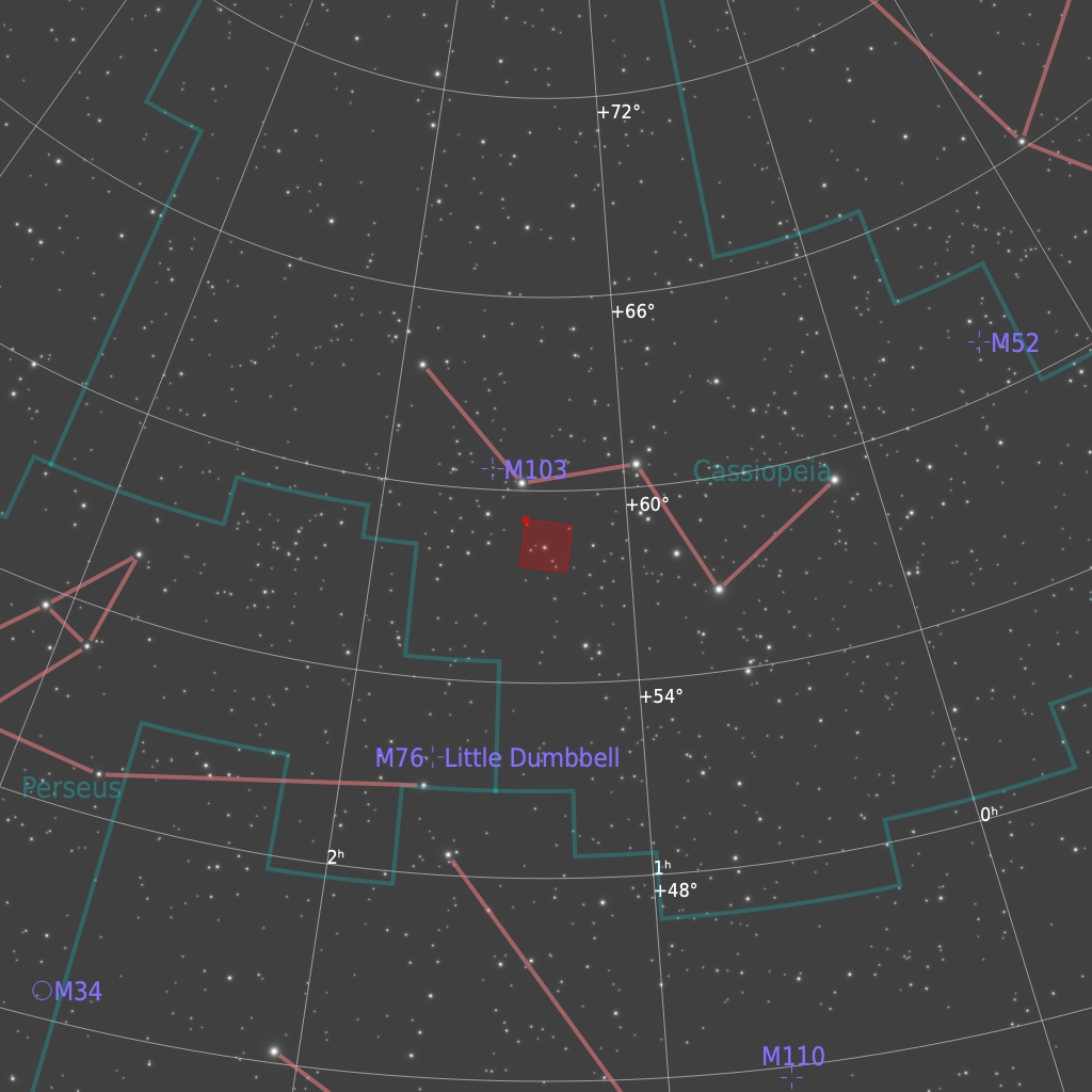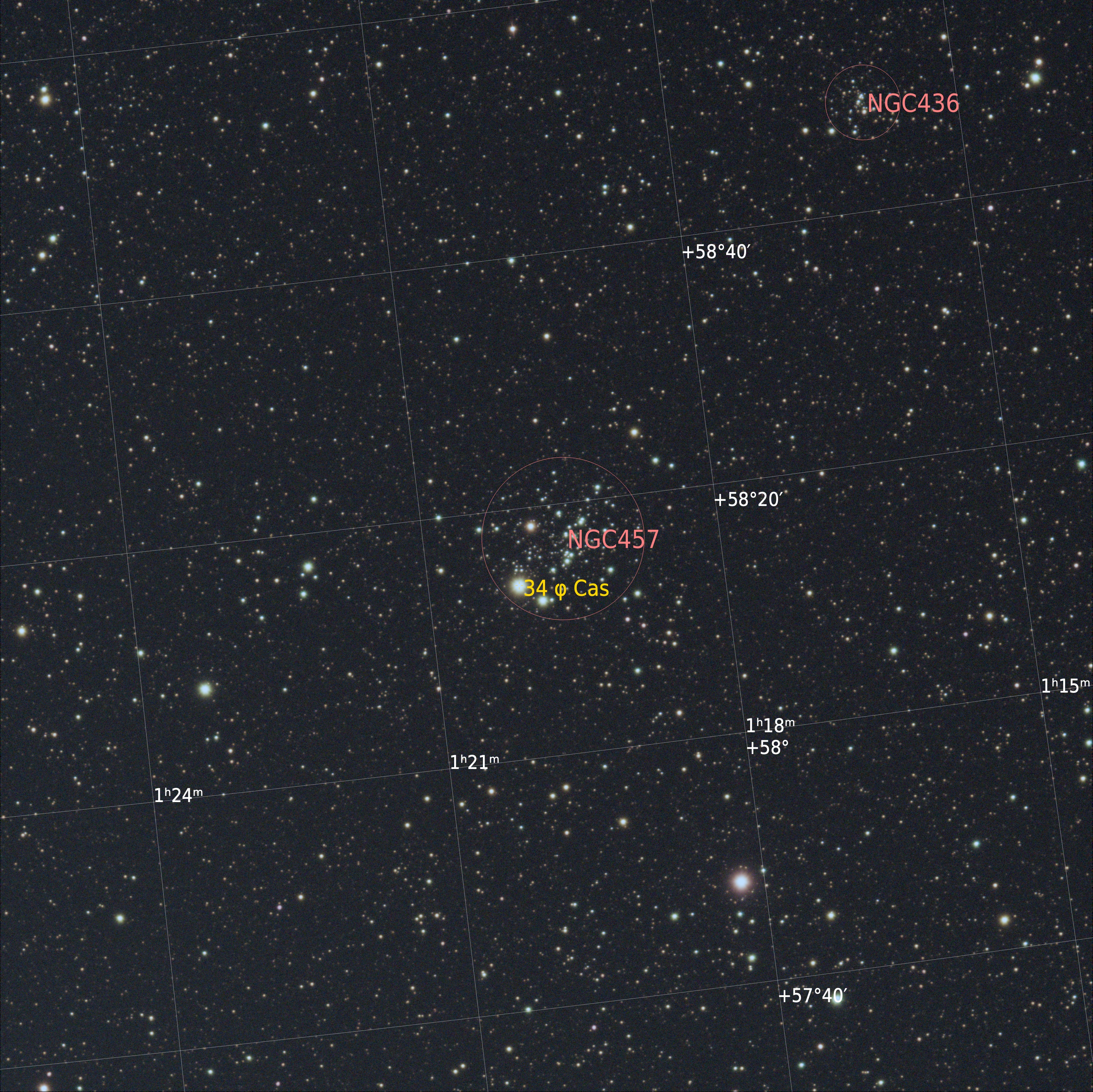 NGC 457 is also known as the Owl Cluster. It is an open star cluster in the constellation Cassiopeia approximately 7,922 light years from Earth with a radius of 15 light years.