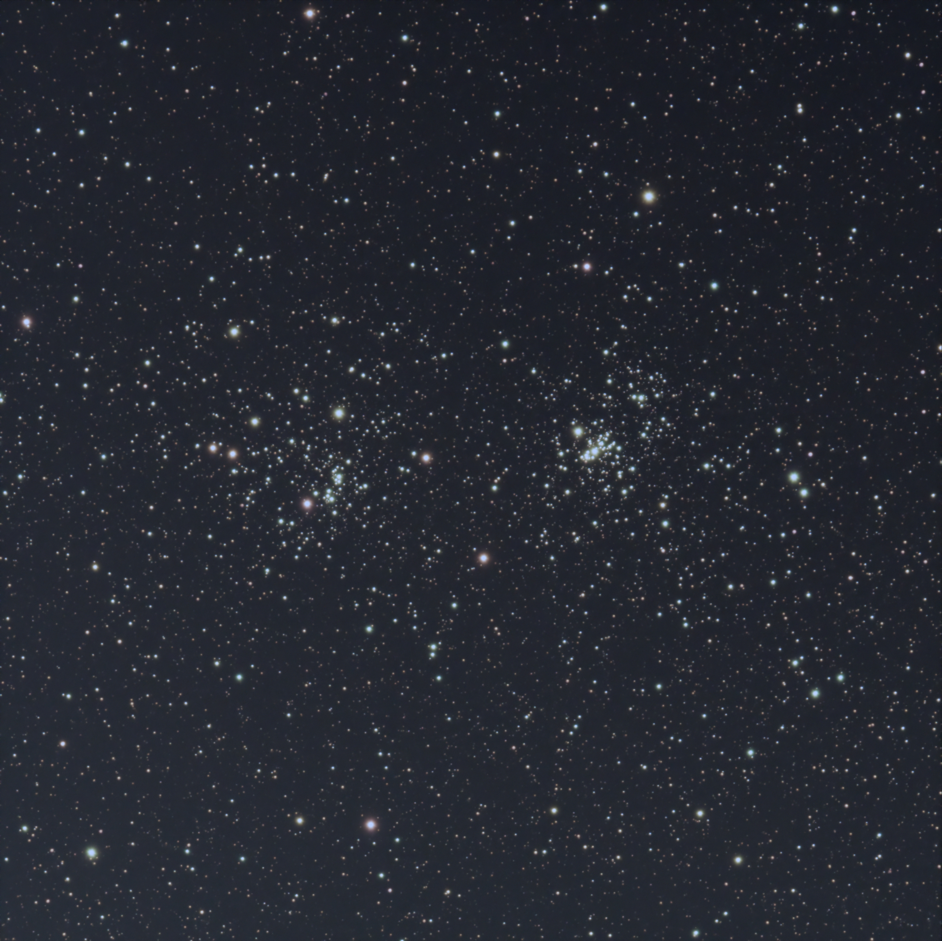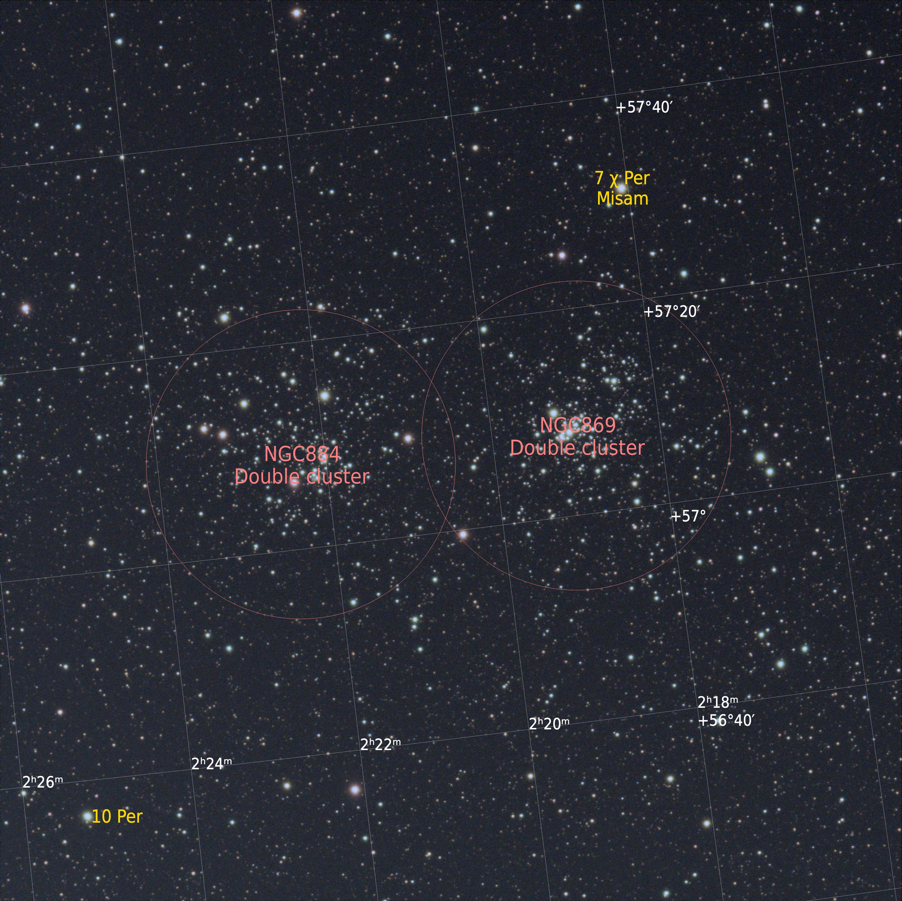 NGC869 & NGC884 are open star clusters. NGC869 is 7460 light years away and NGC884 7640 light years away in the constellation Perseus. Also known as the double cluster for obvious reasons the two components are physically close to each other being only a few hundred light years apart.