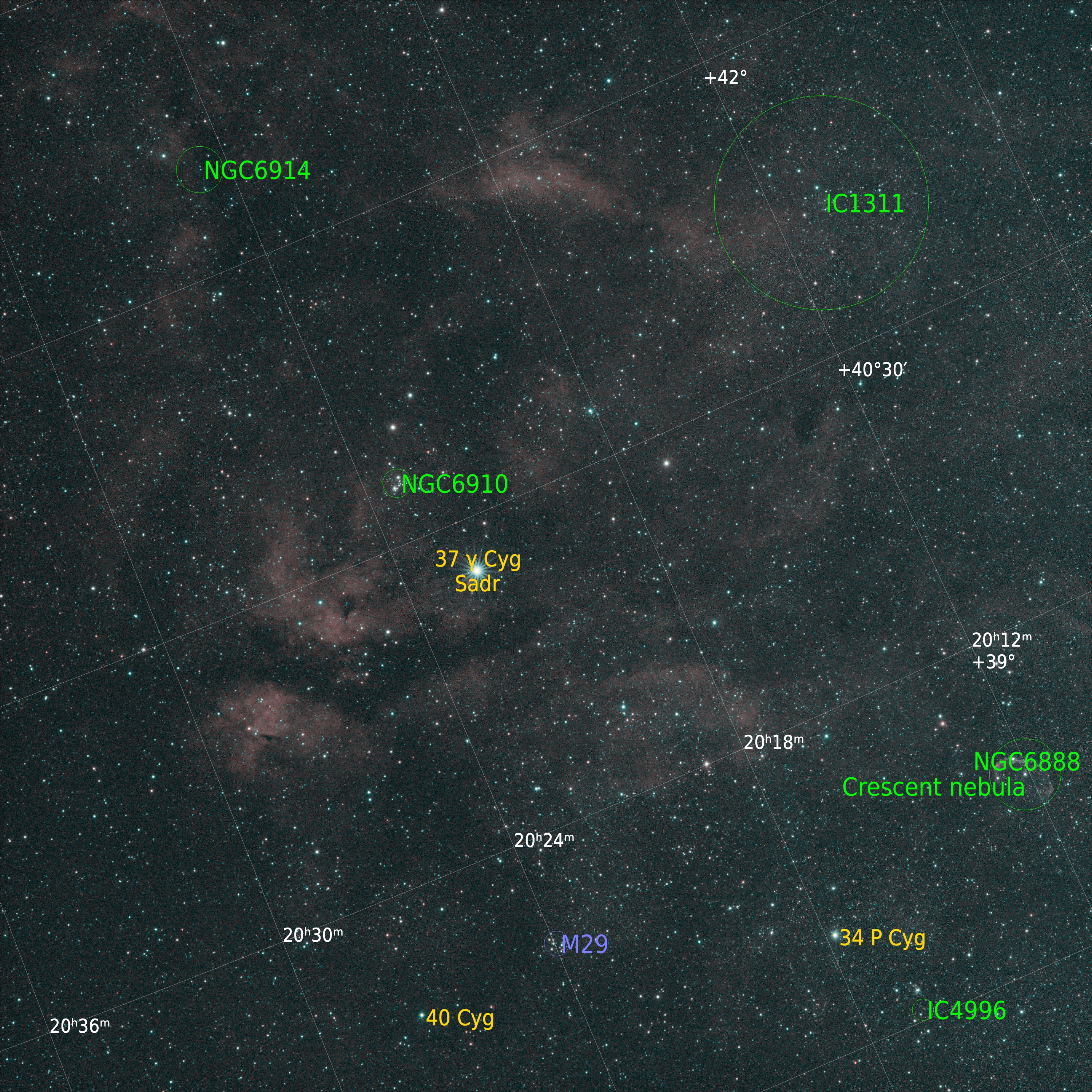 These images of the SADR Region also show the M29 open cluster and the Crescent Nebula NGC 6888.