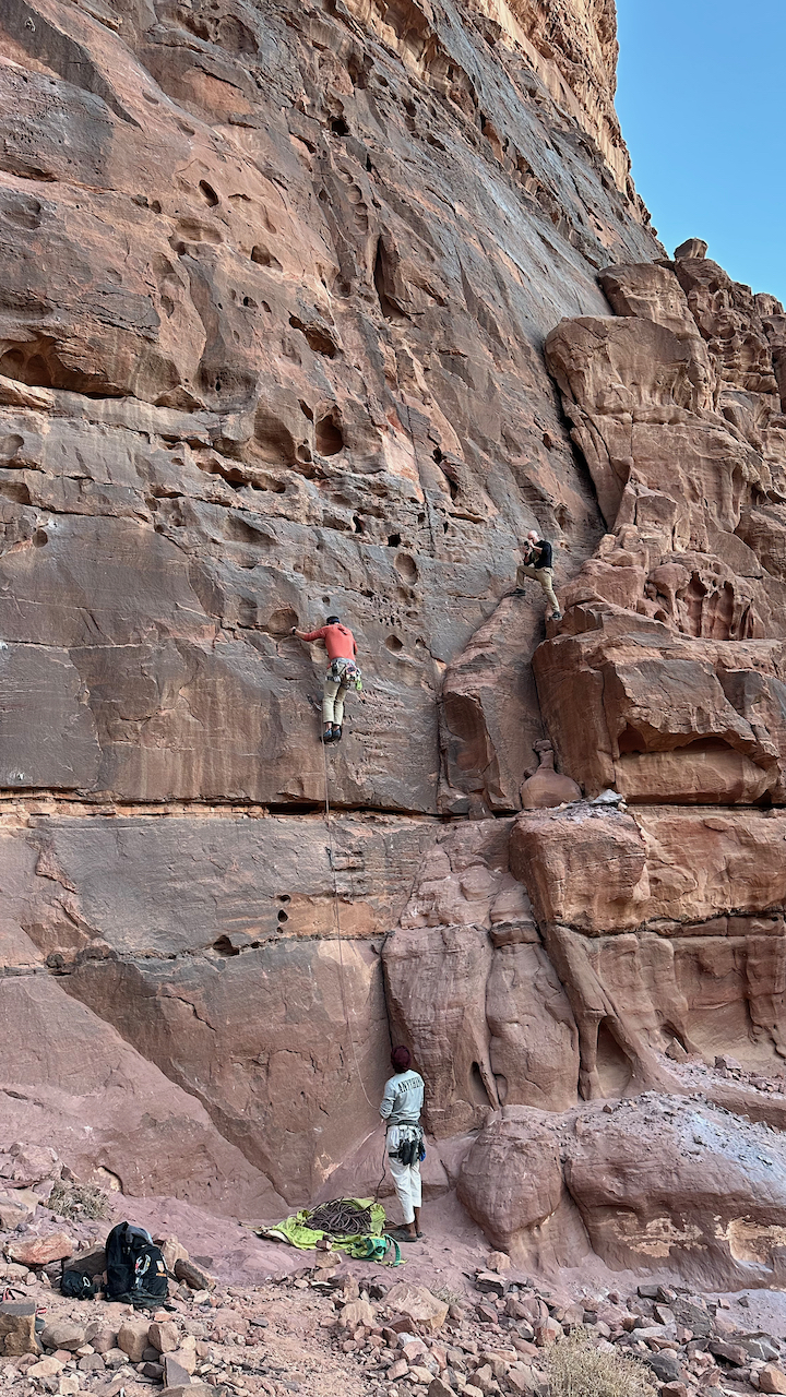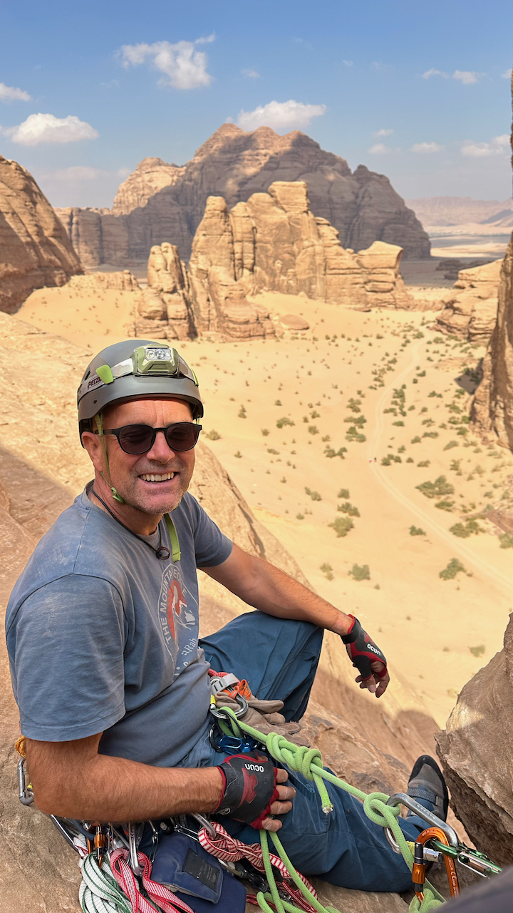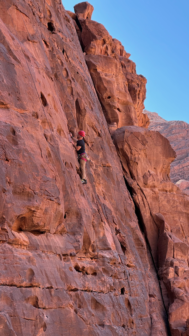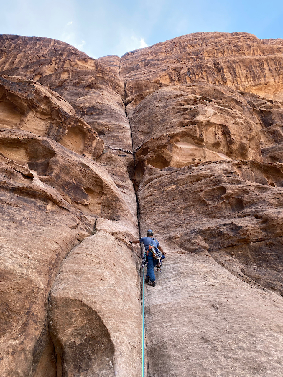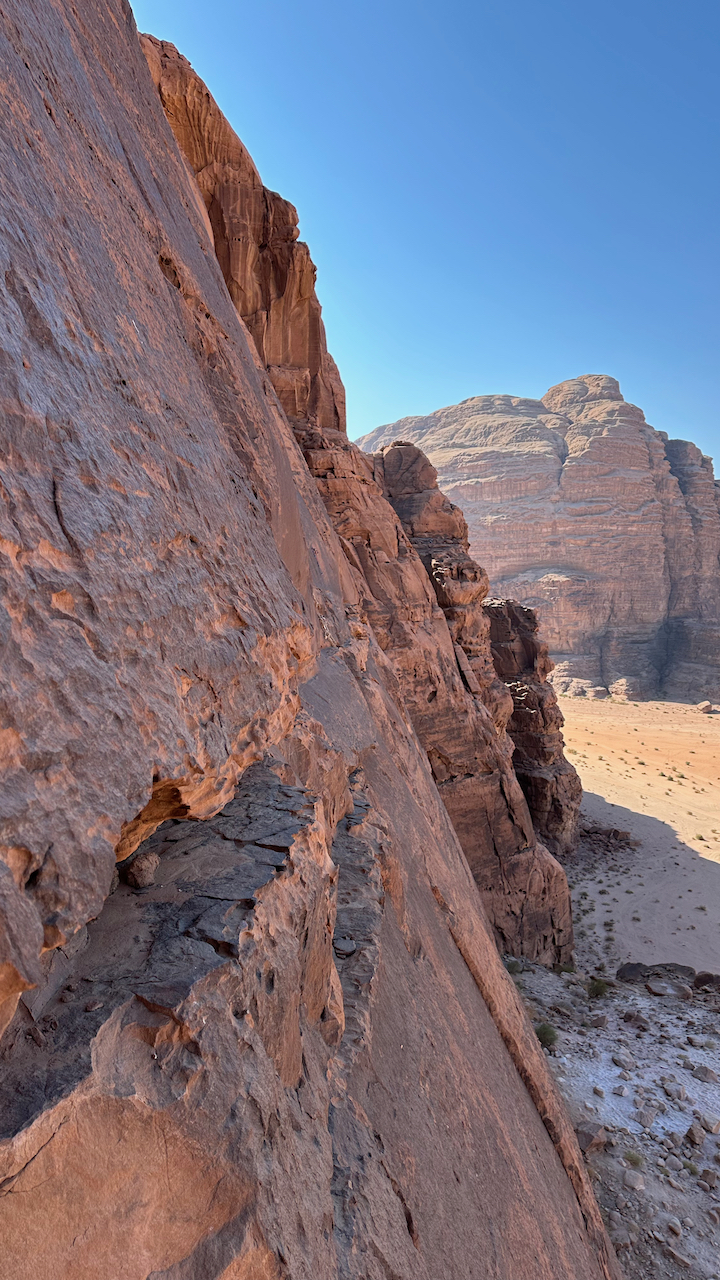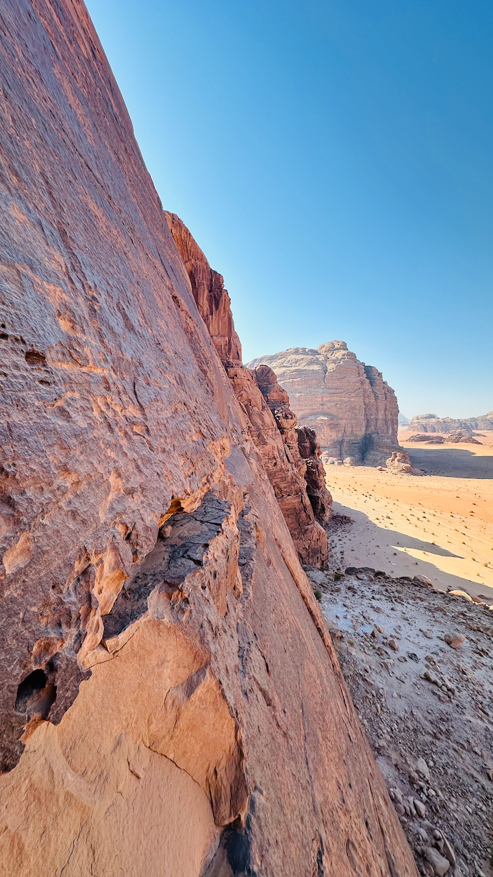 Wadi Rum and the surrounding area proved to be a humbling environment. I knew what I expected, the desert, the rock, the sand, the sky but I wasn't ready for the sheer scale of the place. It is hauntingly beautiful by day and by night but it makes you feel tiny, insignificant even when you are surrounded by 400m plus faces of dense sandstone, arrow straight cracks and lofty domes rising up from the red sand into a perfect blue sky. I had totally underestimated the place. What was I thinking? Having only been back in the climbing game for about eight months! The big trad routes are huge undertakings of four to ten plus pitches and multiple abseil descents or navigationally confusing walk offs. We were definitely not up to that standard yet and I felt totally intimidated to the point of paralysis at the thought of attempting such lines. After an abortive attempt to try the first couple of pitches of Merlin's Wand (Super Crack of Rum) when I was carrying so much gear that I couldn't maintain my balance never mind make much upward progression we confined ourselves mainly to the more manageable (for us) sports routes.