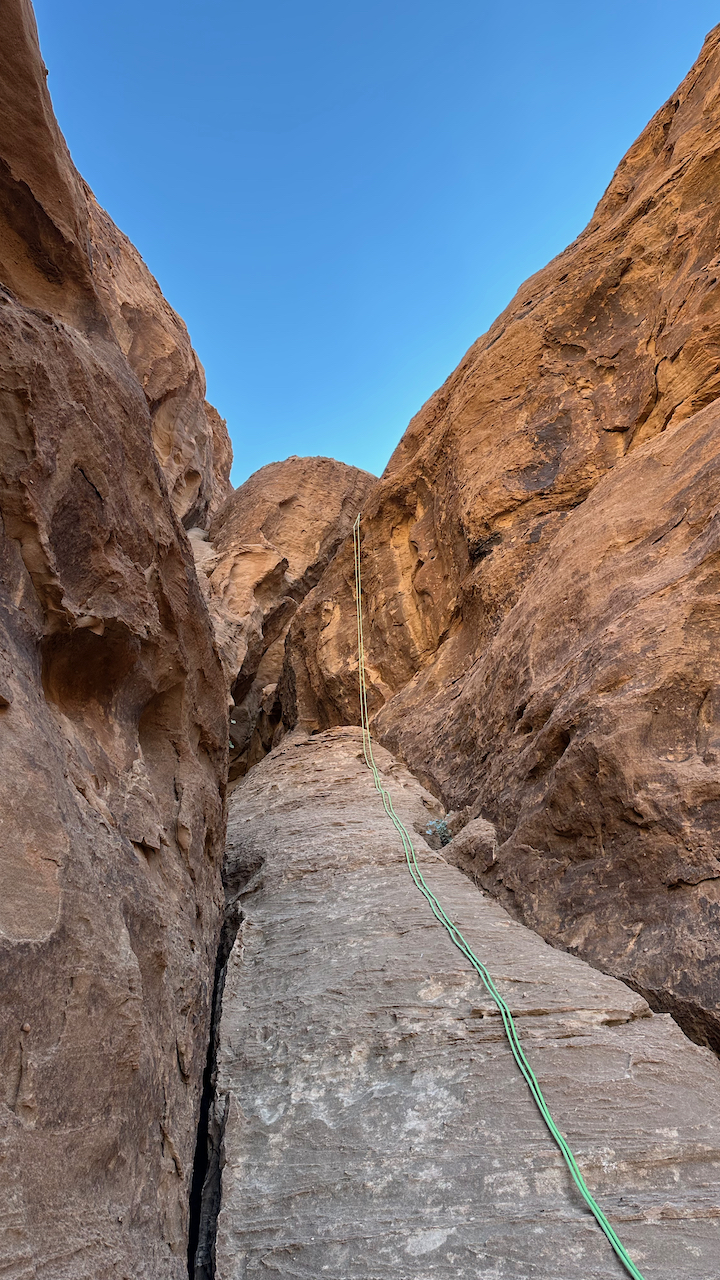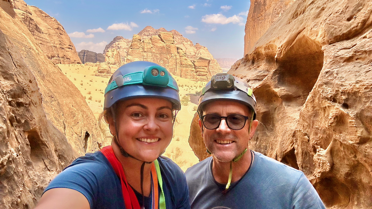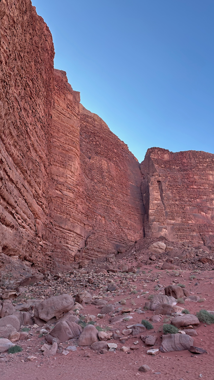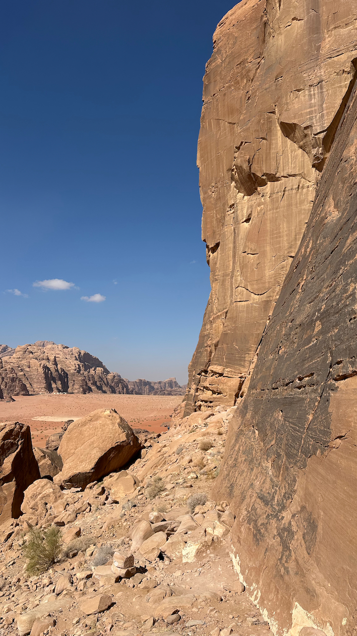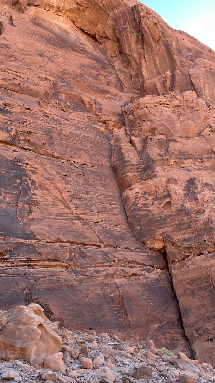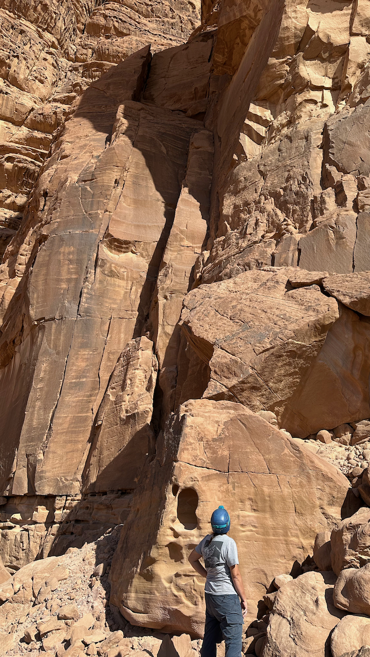 Wadi Rum and the surrounding area proved to be a humbling environment. I knew what I expected, the desert, the rock, the sand, the sky but I wasn't ready for the sheer scale of the place. It is hauntingly beautiful by day and by night but it makes you feel tiny, insignificant even when you are surrounded by 400m plus faces of dense sandstone, arrow straight cracks and lofty domes rising up from the red sand into a perfect blue sky. I had totally underestimated the place. What was I thinking? Having only been back in the climbing game for about eight months! The big trad routes are huge undertakings of four to ten plus pitches and multiple abseil descents or navigationally confusing walk offs. We were definitely not up to that standard yet and I felt totally intimidated to the point of paralysis at the thought of attempting such lines. After an abortive attempt to try the first couple of pitches of Merlin's Wand (Super Crack of Rum) when I was carrying so much gear that I couldn't maintain my balance never mind make much upward progression we confined ourselves mainly to the more manageable (for us) sports routes.