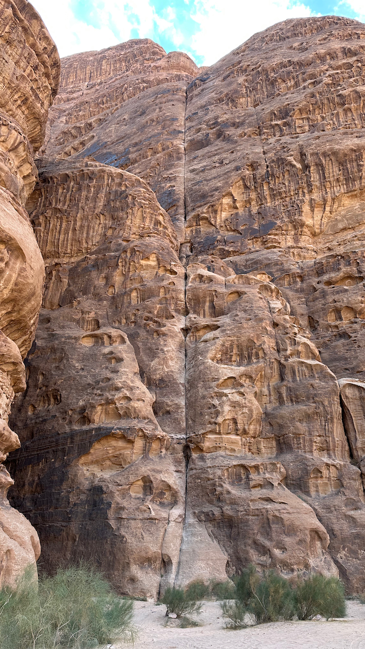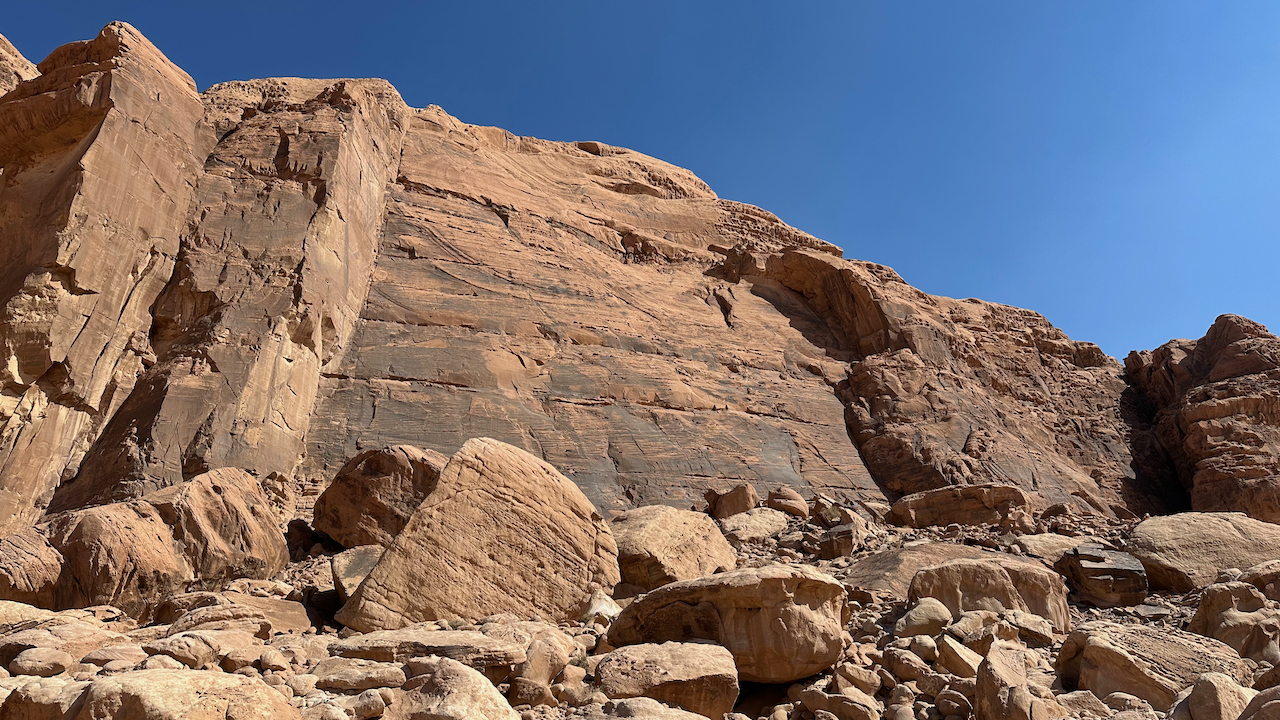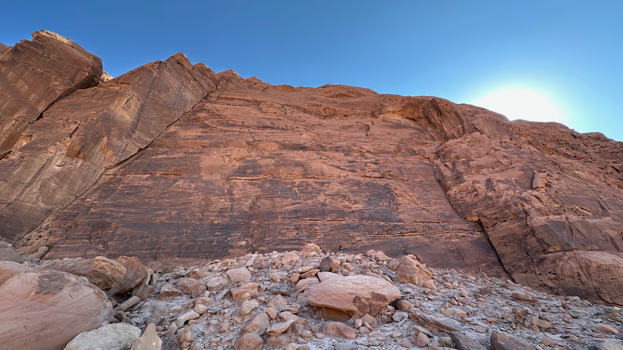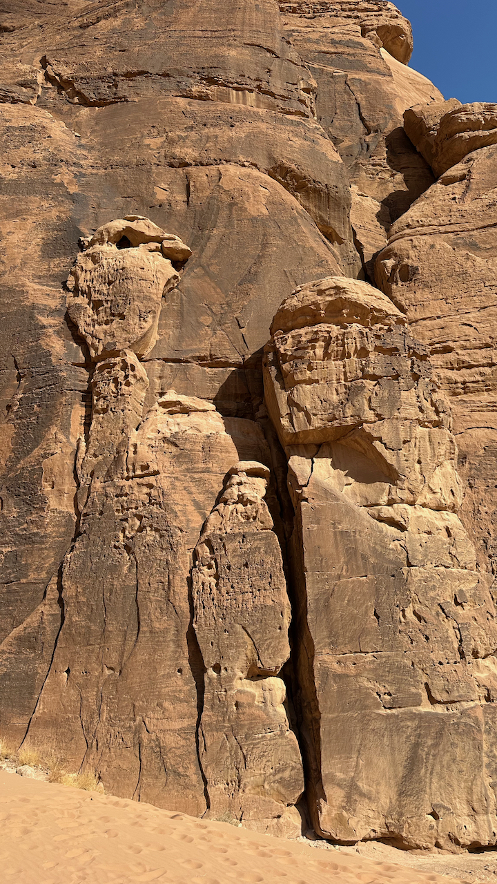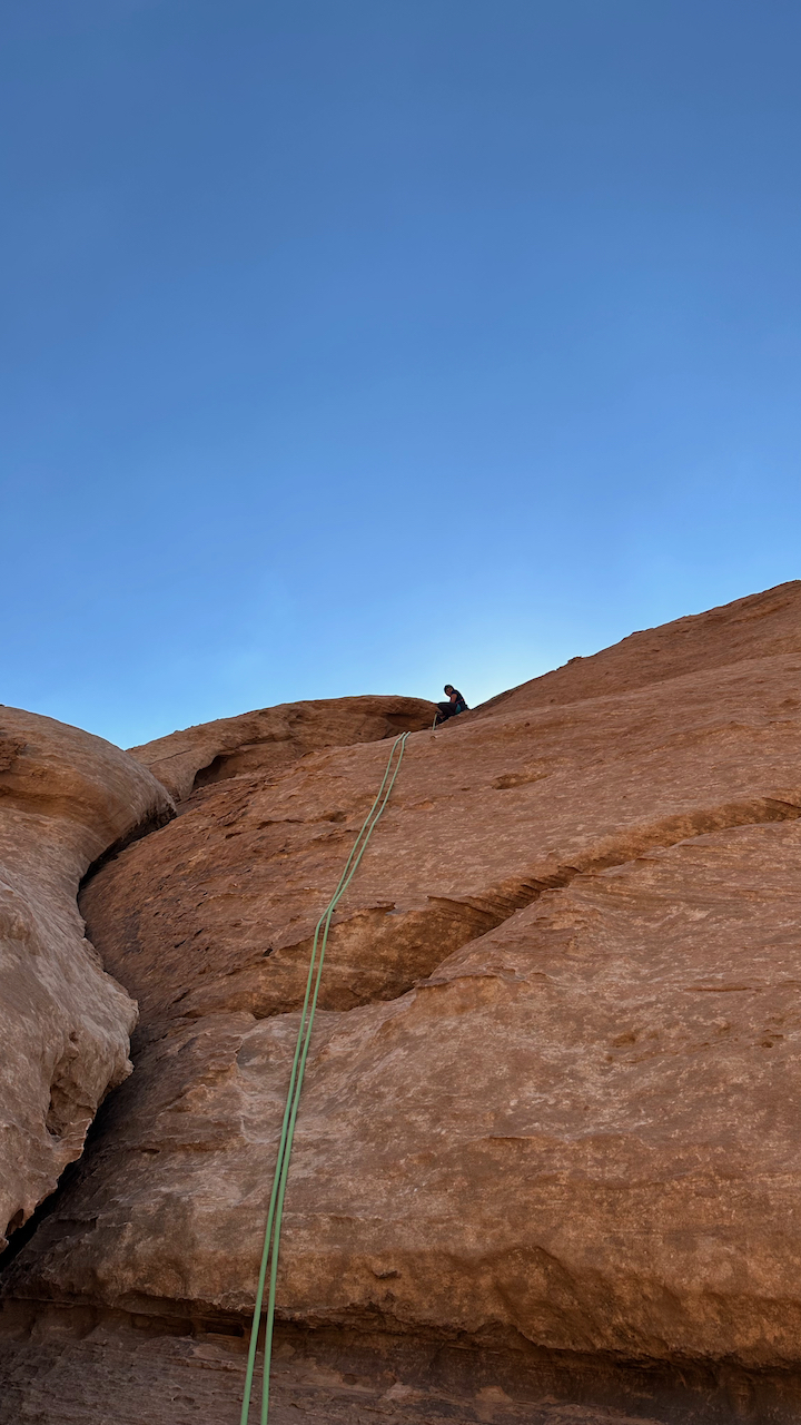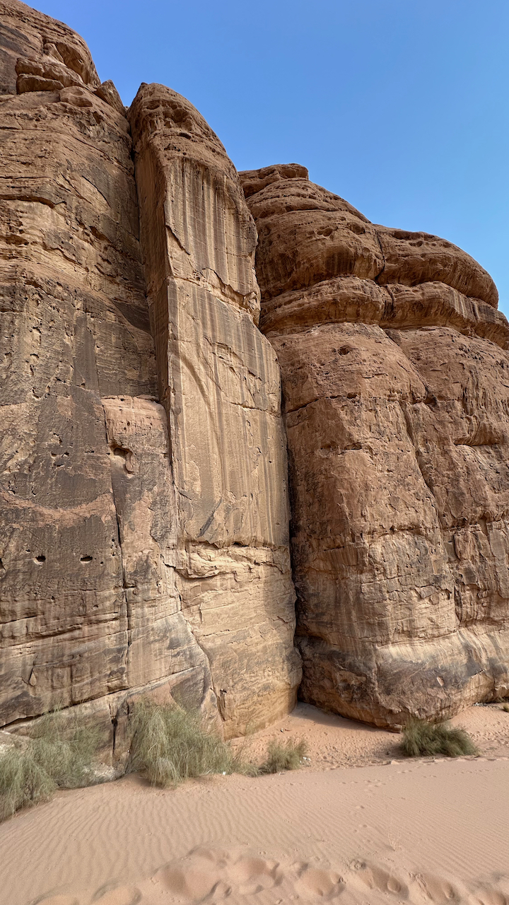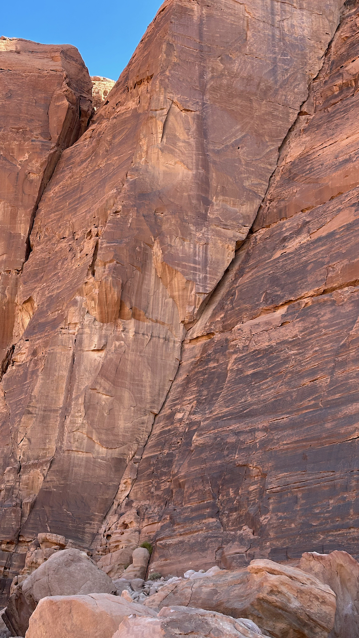 Wadi Rum and the surrounding area proved to be a humbling environment. I knew what I expected, the desert, the rock, the sand, the sky but I wasn't ready for the sheer scale of the place. It is hauntingly beautiful by day and by night but it makes you feel tiny, insignificant even when you are surrounded by 400m plus faces of dense sandstone, arrow straight cracks and lofty domes rising up from the red sand into a perfect blue sky. I had totally underestimated the place. What was I thinking? Having only been back in the climbing game for about eight months! The big trad routes are huge undertakings of four to ten plus pitches and multiple abseil descents or navigationally confusing walk offs. We were definitely not up to that standard yet and I felt totally intimidated to the point of paralysis at the thought of attempting such lines. After an abortive attempt to try the first couple of pitches of Merlin's Wand (Super Crack of Rum) when I was carrying so much gear that I couldn't maintain my balance never mind make much upward progression we confined ourselves mainly to the more manageable (for us) sports routes.
