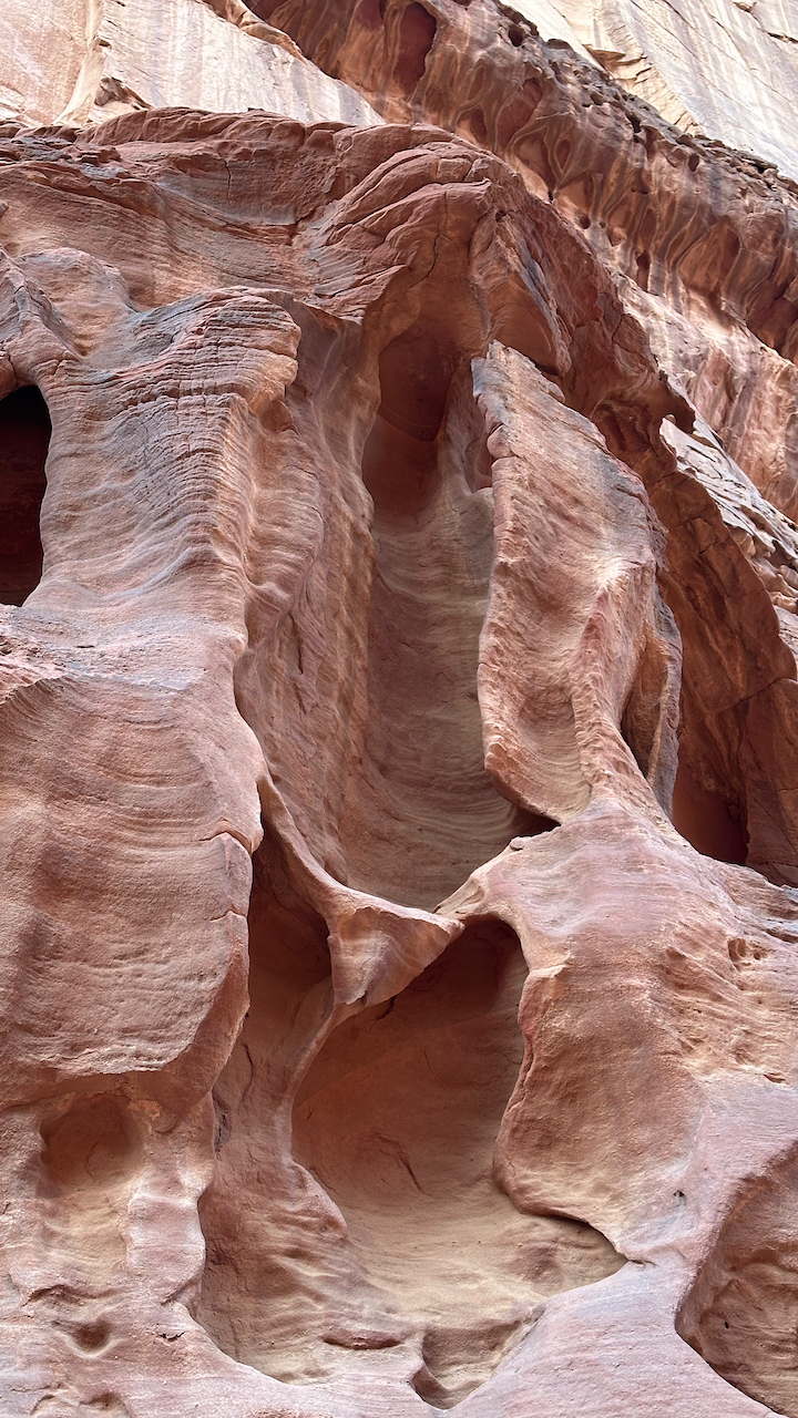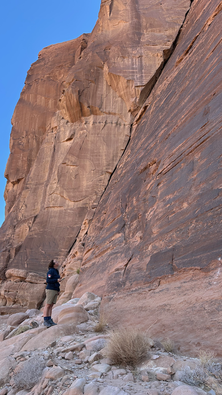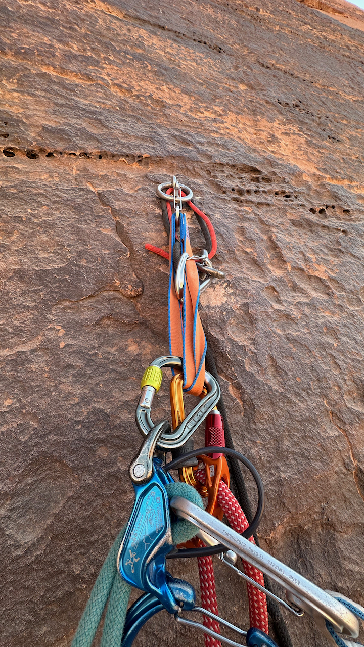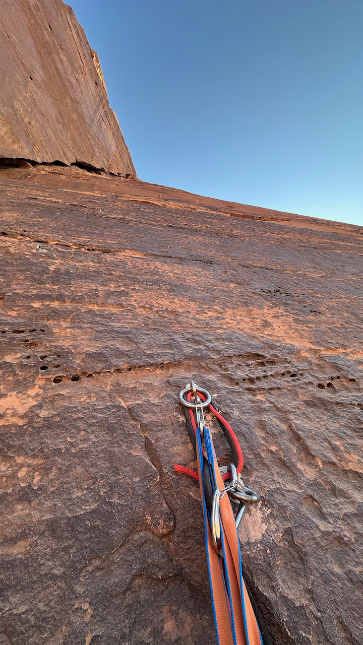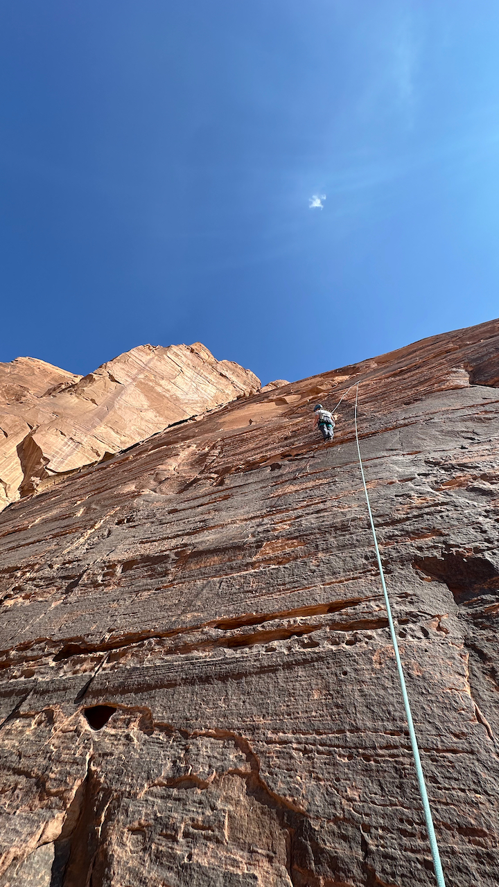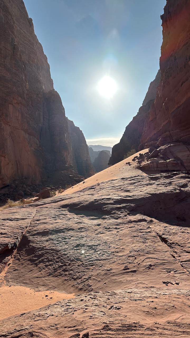 Wadi Rum and the surrounding area proved to be a humbling environment. I knew what I expected, the desert, the rock, the sand, the sky but I wasn't ready for the sheer scale of the place. It is hauntingly beautiful by day and by night but it makes you feel tiny, insignificant even when you are surrounded by 400m plus faces of dense sandstone, arrow straight cracks and lofty domes rising up from the red sand into a perfect blue sky. I had totally underestimated the place. What was I thinking? Having only been back in the climbing game for about eight months! The big trad routes are huge undertakings of four to ten plus pitches and multiple abseil descents or navigationally confusing walk offs. We were definitely not up to that standard yet and I felt totally intimidated to the point of paralysis at the thought of attempting such lines. After an abortive attempt to try the first couple of pitches of Merlin's Wand (Super Crack of Rum) when I was carrying so much gear that I couldn't maintain my balance never mind make much upward progression we confined ourselves mainly to the more manageable (for us) sports routes.