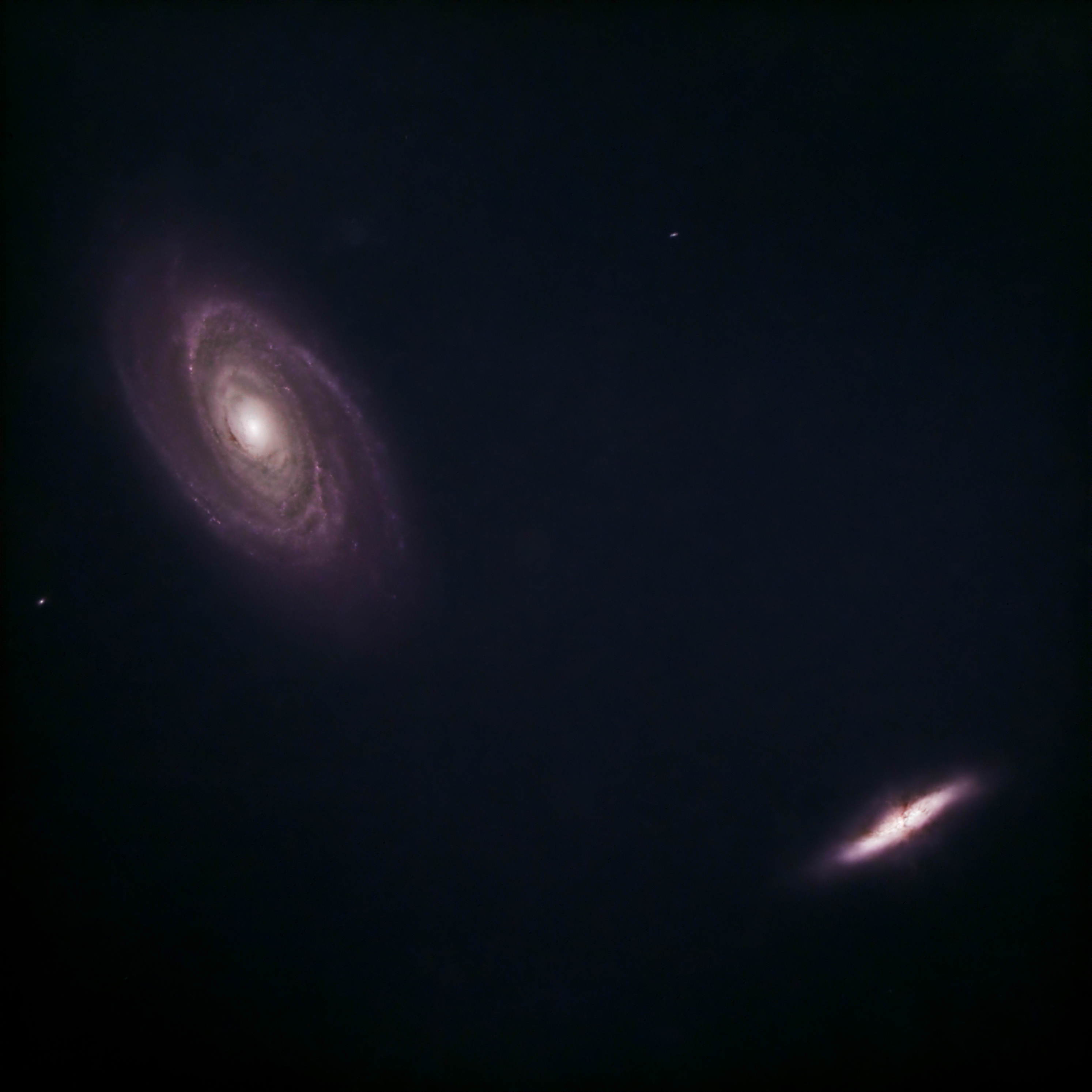 These two galaxies appear in the constellation Ursa Major. M81 (Bode's Galaxy) & M82 (Cigar Galaxy) are approximately 12 million light years distant and are separated by at least 130,000 light years.