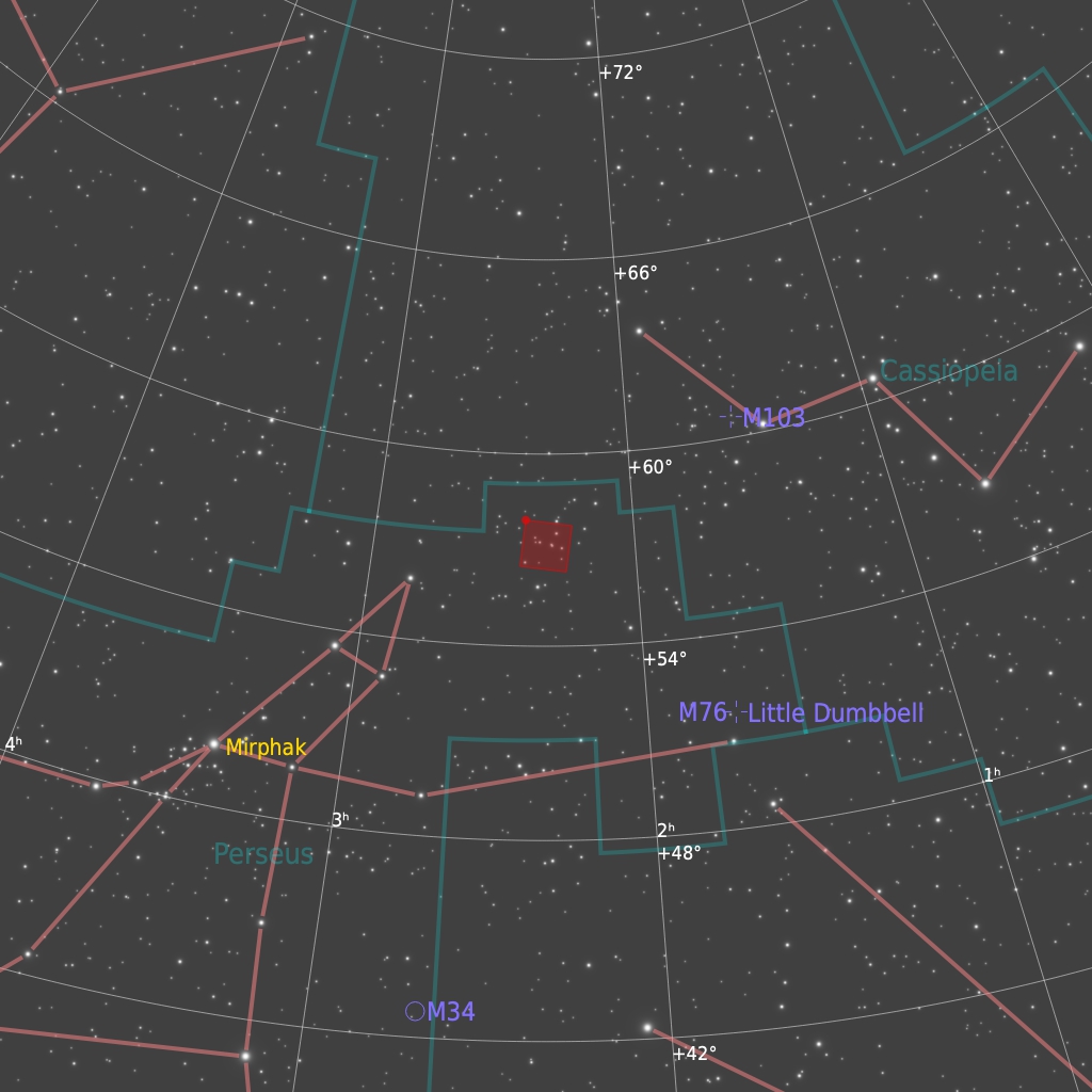 NGC869 & NGC884 are open star clusters. NGC869 is 7460 light years away and NGC884 7640 light years away in the constellation Perseus. Also known as the double cluster for obvious reasons the two components are physically close to each other being only a few hundred light years apart.